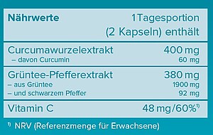 Nahrungsergänzungsmittel mit Extrakten aus Curcuma (Gelbwurz), Grüntee, Pfeffer und Vitamin C