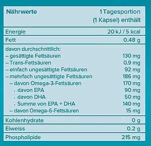 Krillöl 68% (Herkunft: Antarktis); Antioxidans: Rosmarinextrakt; Kapselhülle: Gelatine; Feuchthaltemittel: Sorbitol, Glycerin.