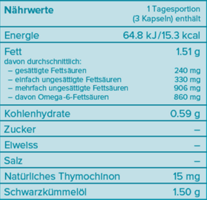Schwarzkümmelöl kaltgepresst (Herkunft: Ägypten), Antioxidans: Rosmarinextrakt; Kapselhülle: Modifizierte Stärke, Karrageen; Feuchthaltemittel: Glycerin.